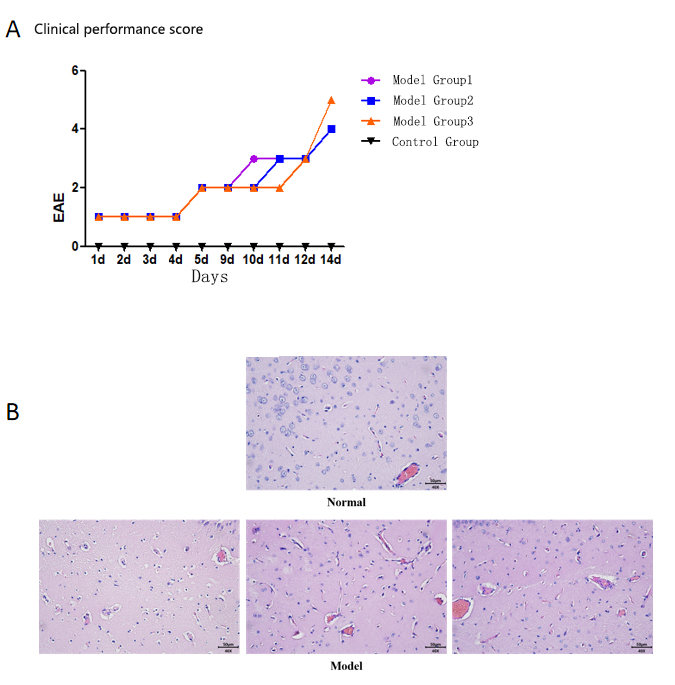 Fig. 5 Model of autoimmune encephalomyelitis. A Behavior ability score. B Compared with the normal group, the model group can see small blood vessel hyperemia, neuron degeneration is more obvious, the cell body is enlarged, the shape is round, the nucleus is offset, and the nucleolus disappears